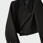 Minimalistično kratko sako z elegantnim dizajnom in modernimi detajli. Ovratnik z ostrimi linijami in sprednje zapiranje dodajata dinamičen značaj, medtem ko kratka linija omogoča, da je idealno za stilne videze. Enostavno se nosi tako na delovnih kot tudi na večernih priložnostih.