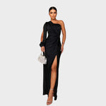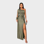 Obleka Laura z enim ramenom uteleša brezskrbno sofisticiranost. Izdelana iz tekočega materiala, ki se prilega telesu, ustvarja podolgovato silhueto. Ohlapen rokav in nežni naborki se gibajo z vsakim korakom, medtem ko subtilni stranski razporek doda privlačnost. Popolna za gala večerje, poroke in elegantna praznovanja.