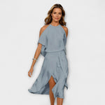 Odkrijte obleko Madonna, utelešenje brezskrbne elegance. Te asimetrične midi obleke z razkritimi rameni izžarevajo gracioznost zahvaljujoč svojemu padajočemu materialu, ki se s vsakim korakom premika elegantno. Sofisticiran dizajn z halter izrezom jih naredi nujen kos v vaši garderobi.