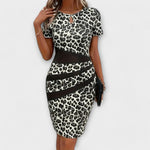 Poudarite svojo silhueto s to očarljivo obleko z leopardjim potiskom, ki združuje sodoben dizajn z ženskastim izrezom v obliki ključa.