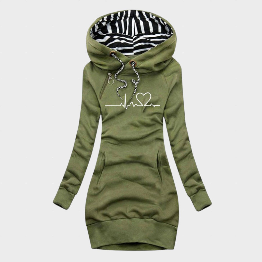 Vstopite v zimo s popolno kombinacijo stila in udobja – s Helena pulover obleko! Ta eleganten dizajn z modernim srčnim vzorcem dodaja vašemu garderobniku pridih elegance. Idealna za vsako priložnost, bodisi da se odpravljate ven ali uživate v sproščenem večeru doma.